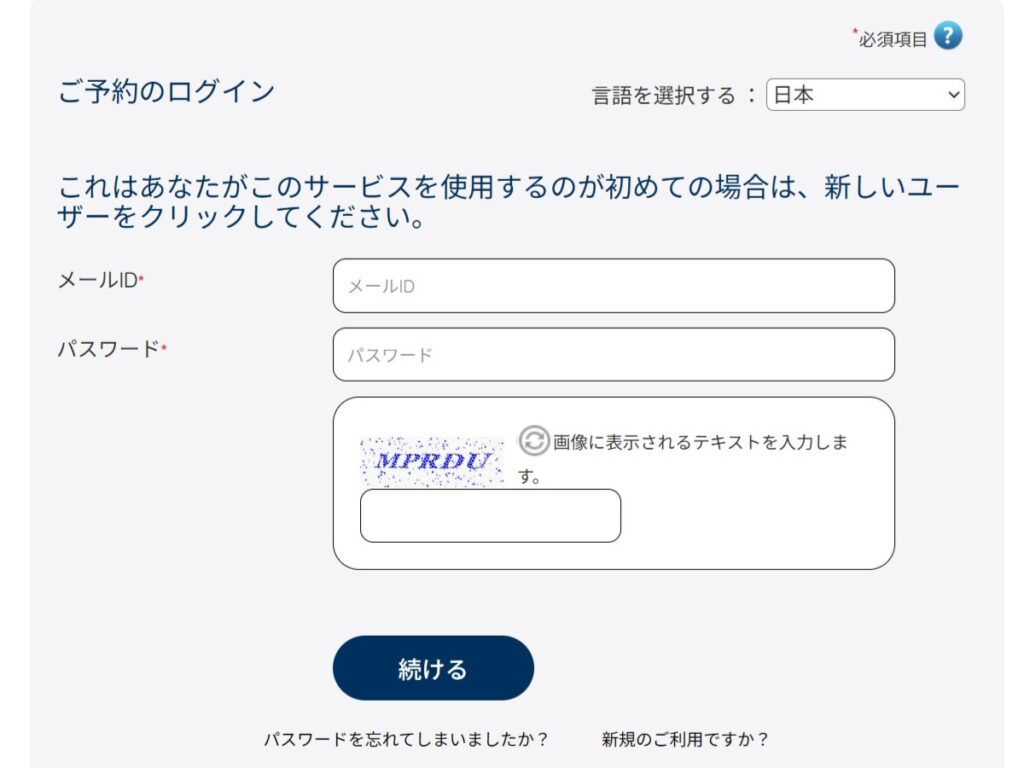 アカウントがアクティブになったことを確認したら、改めて「ご予約のログイン」ページから上記で新規作成した[メールID]と[パスワード]をそれぞれ入力し、ランダム表示される英文字テキストをフィールド内に入力後、[続ける (Continue)]をクリック。