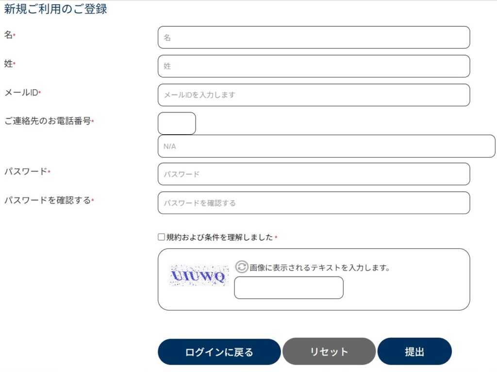 - [□規約および条件を理解しました (I Acknowledge terms and conditions.)]にチェックを入れ、ランダム表示される英文字テキストをフィールド内に入力後[提出 (Submit)]ボタンをクリックする。