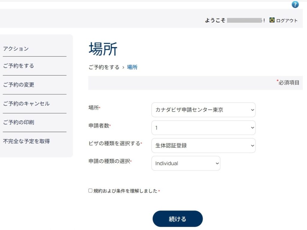 - 場所 (Select Centre) ⇒ [カナダビザ申請センター東京 (Canada Visa Application Center – Tokyo)]
