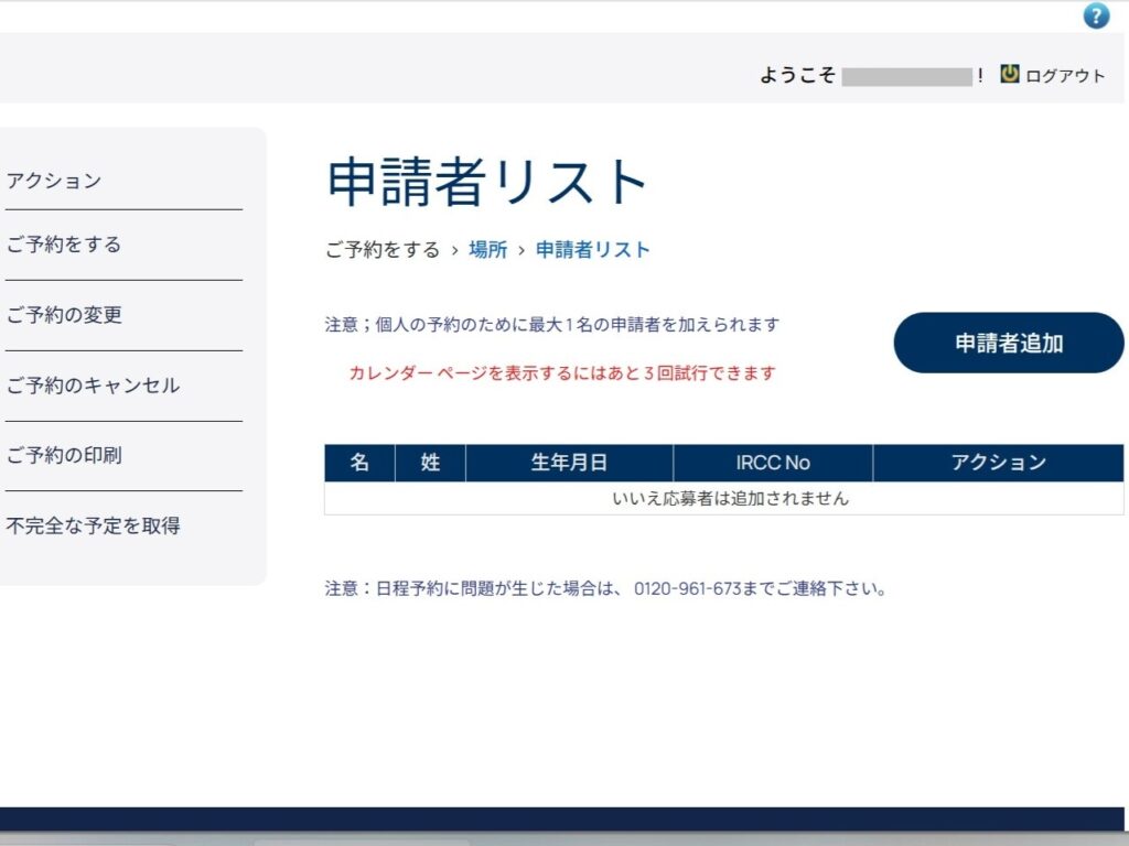 VFS. GLOBALからバイオメトリクス(個人識別情報登録)予約を入れる