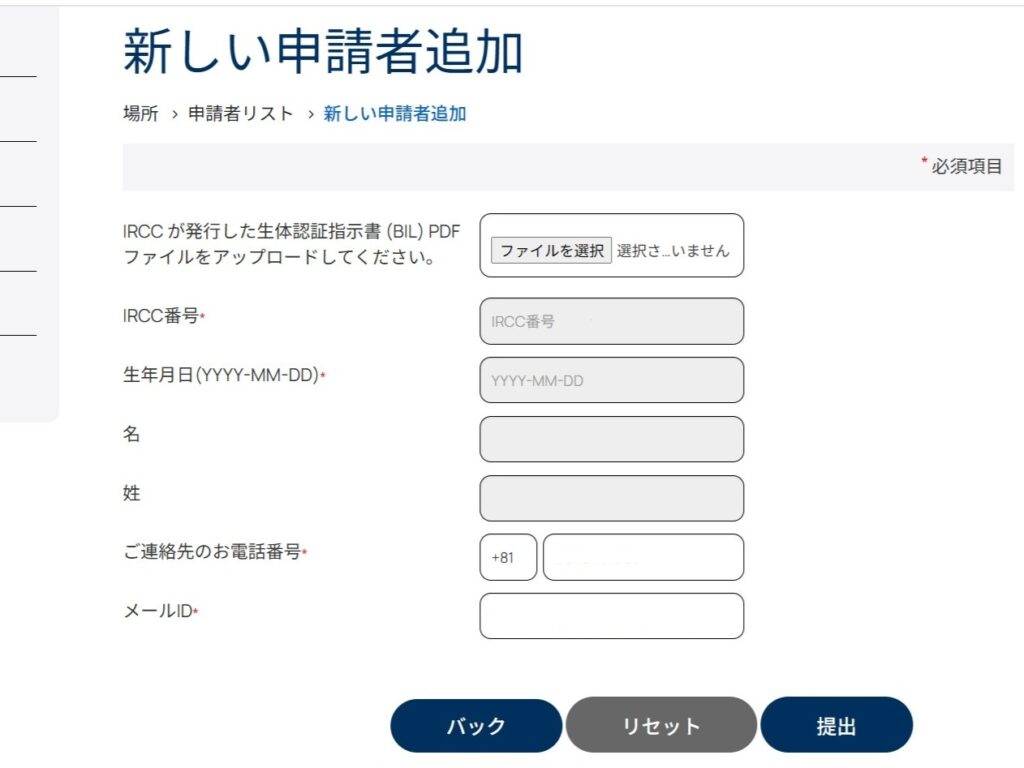 - [IRCCが発行した生体認証指示書 (BIL) PDFファイルをアップロードしてください。] ⇒