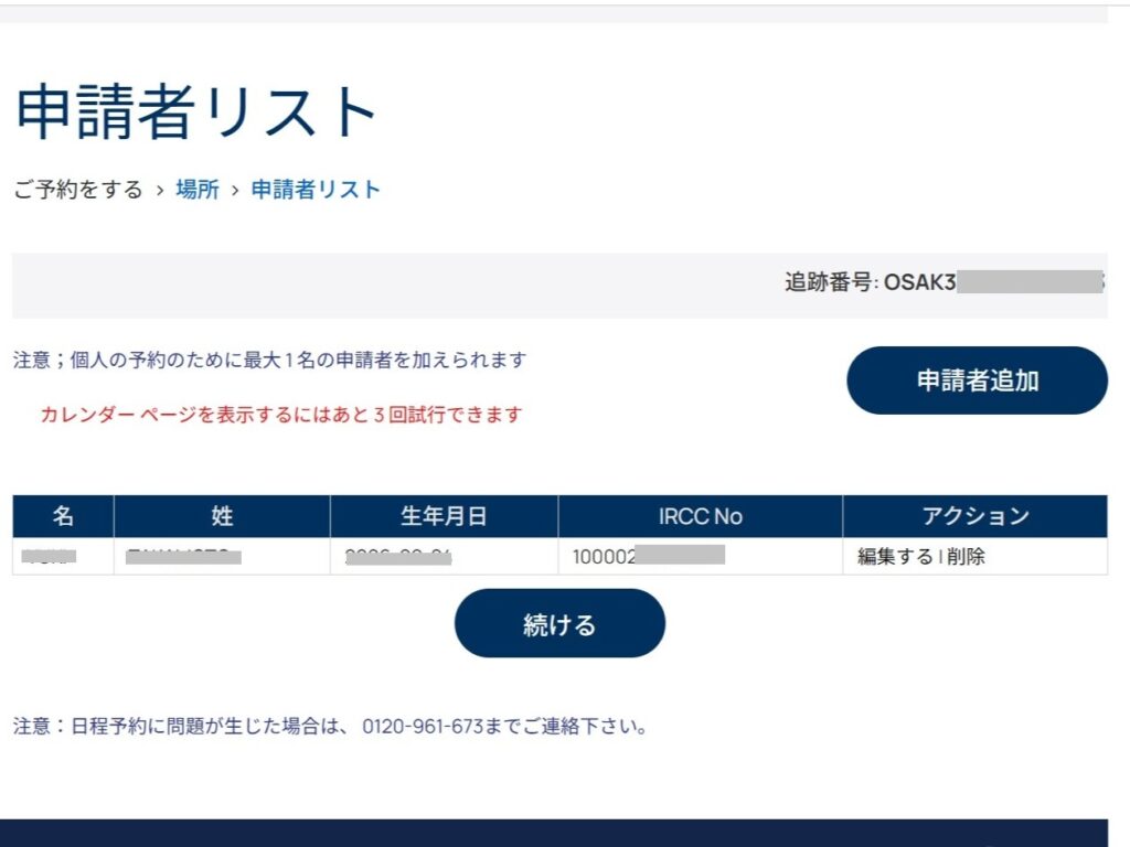 申請者リストに先ほど入力した名前、生年月日、IRCC番号などの情報が追加されているのを確認し、間違いがなければ[続ける (Continue)]をクリック。