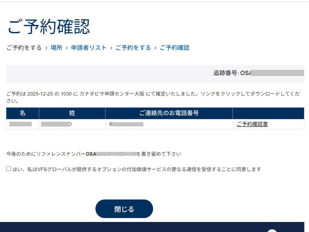 予約が無事取れたことを確認したら[閉じる]をクリックして終了。